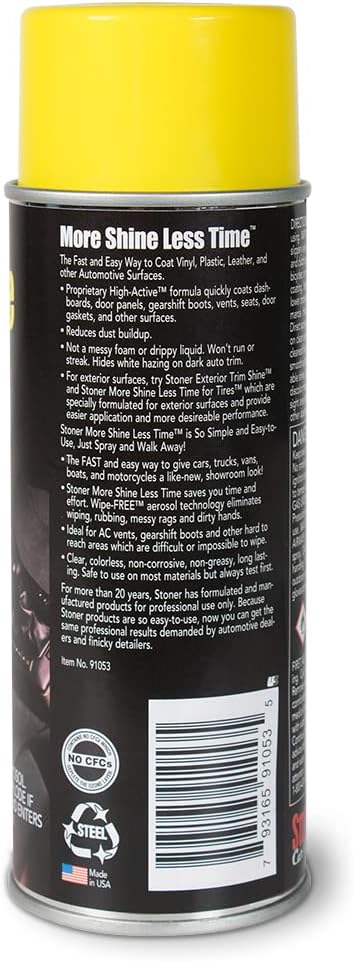 Stoner Car Care Pro 91053 More Shine Less Time Protectant – 9-Ounce is the FAST and EASY way to restore shine and color to dull or faded rubber, vinyl and plastic surfaces. Stoner More Shine Less Time (MSLT) is made for that Interior Shine. It sprays quickly to brighten and protect dashboards, door panels, gearshift boots, vents, seats, hoses, door gaskets and other surfaces damaged by sunlight and wear. Needs no rubbing or wiping, just spray and walk away.